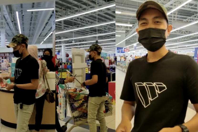Video tersebut dimuat naik oleh isterinya, menunjukan pemuda berkenaan yang sedang memeriksa resit pembelian leka berjalan ke arah troli wanita lain.