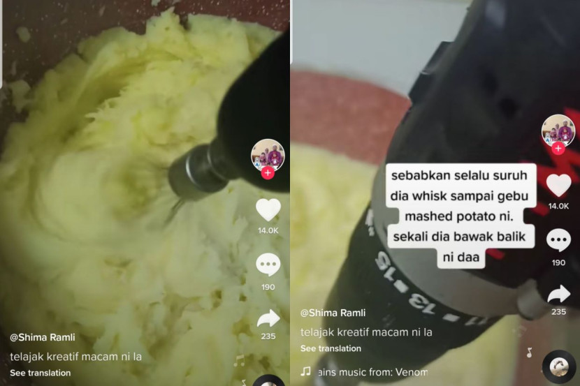 “Kami pernah beli hand blender tapi lama-lama dia loose, jadi whisk yang dari hand blender tu dia sambung dekat drill, jadi memang mudah kerja dan result dia memang gebu sangat mashed potato tu,” katanya, menambah mereka kini menggunakan alat tersebut setiap hari.