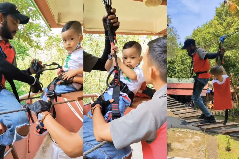 Video yang dirakam oleh ibunya itu memaparkan kanak-kanak berkenaan bersiap sedia untuk melakukan aktivit ekstrem iaitu flying fox.
