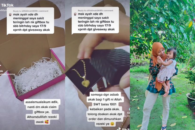 “Mak ayah tak ada dah meninggal, saya sakit teringlah nak giftbox tu sebab birthday saya 17/9 tak pernah dapat giveaway akak,” tulis Fatimah di ruangan komen Nadia Bahrain,25, yang pada ketika itu baru memulakan perniagaan giftboxnya secara dalam talian.