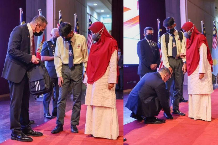 TINDAKAN spontan Menteri Kanan Pertahanan, Datuk Seri Hishammuddin mengikat tali kasut seorang pelajar yang berada di atas pentas dalam satu majlis mencuri tumpuan. Video momen yang mungkin berlaku sekali seumur hidup buat pelajar bertuah itu turut dikongsi Hishammuddin menerusi laman sosial beliau. "Adik Adib datang Kementerian Pertahanan hari ini. Dari Kuala Kubu Bharu. ARTIKEL BERKAITAN: 'Pakar bedah daun' akhirnya bertemu Tun M, bersengkang mata sampai pukul 2.30 pagi hasilkan satu lagi buah tangan ARTIKEL BERKAITAN: Akhirnya YB KJ Dapat Kuih Kapit Farid! "Kemas, segak. Cuma tali kasut nak terlerai masa naik pentas. "Tak pe. Biar Menhan (Menteri Pertahanan) betulkan. Jumpa lagi Adib. "Belajar rajin-rajin. Stay safe. Saya doakan berjaya dunia akhirat!" tulis Hishammuddin. Ternyata momen yang cukup bermakna tu tidak pernah dijangka oleh Adib Haqiem Mohd Khalid yang berusia 16 tahun. Bercakap kepada mStar, pelajar Sekolah Agama Menengah Tinggi Kuala Kubu Bharu (SAMTKKB) itu berkata, sehingga kini dia sukar untuk mempercayai apa yang berlaku di pentas ketika berlangsungnya majlis di Kementerian Pertahanan di Kuala Lumpur, pada Isnin. "Saya terharu dan terkejut. Macam tak percaya, tapi pada masa sama saya berasa amat bangga, memang akan simpan baik-baik kasut tu. "Datuk Seri sempat beri pesanan supaya saya belajar rajin-rajin. "Terima kasih Datuk Seri ikatkan tali kasut saya. Dan saya akan ingat pesanan Datuk Seri untuk belajar rajin-rajin dan menjadi orang yang berjaya," katanya ketika dihubungi. Adib (kanan) bersama ibu di majlis di Kementerian Pertahanan. Pada Isnin, pelajar yang lebih mesra disapa Adib hadir bersama ibunya ke Kementerian Pertahanan bagi menerima sumbangan peralatan persekolahan kepada anak-anak anggota Angkatan Tentera Malaysia (ATM) dan warga awam kementerian itu. Anak kelahiran Kuala Kubu Bharu itu turut berkongsi momen sewaktu berada di atas pentas bersama ibunya berusia 53 tahun dan bertemu Hishammuddin. Terima kasih Datuk Seri ikatkan tali kasut saya. Dan saya akan ingat pesanan Datuk Seri untuk belajar rajin-rajin dan menjadi orang yang berjaya ADIB HAQIEM MOHD KHALID "Datuk Seri ada tanya rambut saya potong kat mana? Tapi entah kenapa, masa tu saya speechless, tergamam nak jawab soalan Datuk Seri. "Sebenarnya saya potong rambut kat kedai biasa-biasa je di Rawang, Selangor. Tapi kalau Datuk Seri sudi, boleh je saya tunjukkan kedai tu," ujarnya. Adib mahu mengikut jejak langkah arwah bapa sebagai anggota tentera. Adib yang merupakan anak bongsu daripada lima beradik itu juga mahu mengikut jejak langkah arwah bapanya menjadi anggota tentera. "Cita-cita saya nak jadi askar, macam arwah ayah. Arwah ayah, mak dan keluarga adalah sumber inspirasi saya untuk berjaya. InsyaAllah saya akan buktikan," katanya sambil menambah bapanya meninggal dunia akibat sakit jantung ketika usia 47 tahun, pada 2011. Sikap merendah diri Hishammuddin bukan perkara baharu kerana beliau sebelum ini juga pernah membetulkan tali kasut seorang pelajar lain dalam satu majlis. Aksi spontan Ahli Parlimen Sembrong itu yang begitu mesra dan ramah serta mudah didekati membuatkan ramai menyifatkan beliau sebagai pemimpin berjiwa rakyat. Dapatkan info dengan mudah dan pantas! Join grup Telegram mStar DI SINI