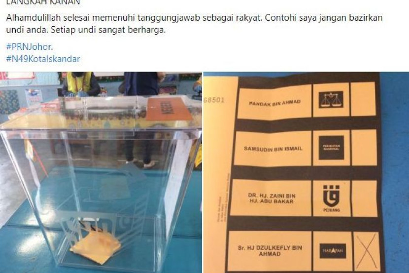 Menerusi perkongsian yang dibuat itu, pemilik akaun Facebook, Mohd Azam Mektar dipercayai memuat naik kertas undiannya selepas membuang undi di PRN Johor yang dipercayai dibuat di kerusi Dewan Undangan Negeri (DUN) Kota Iskandar.