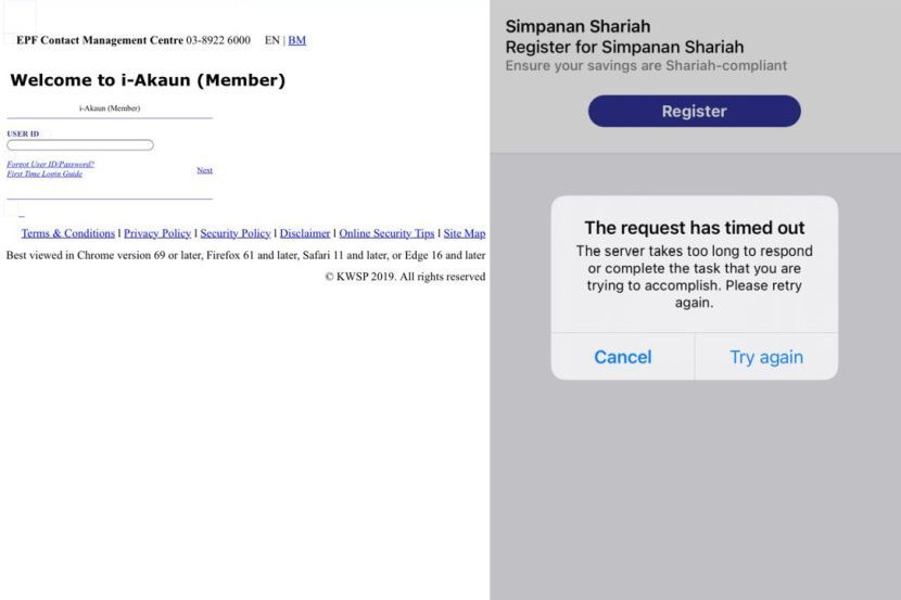 Laman web rasmi KWSP serta aplikasi i-Akaun yang mengalami kesukaran untuk diakses selepas PM membuat pengumuman sebentar tadi.