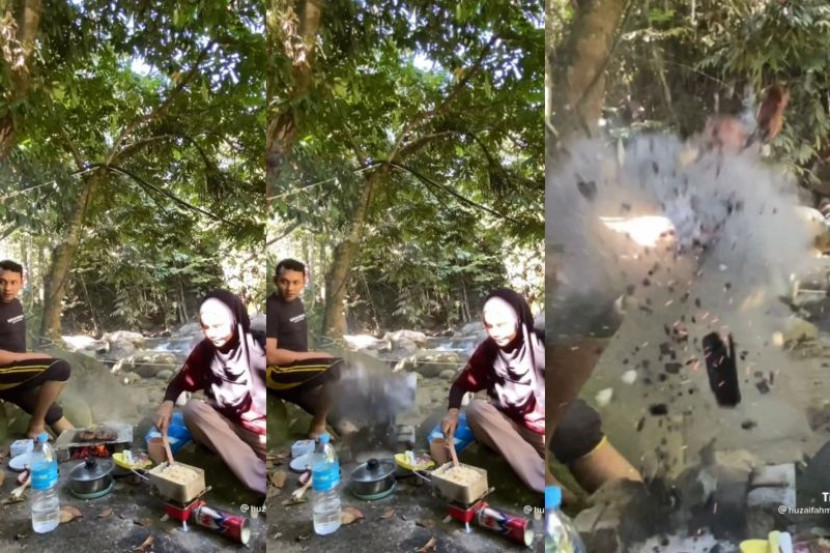 Mana tidaknya, sedang asyik membakar daging, secara tiba-tiba tempat barbeku tersebut meletup!