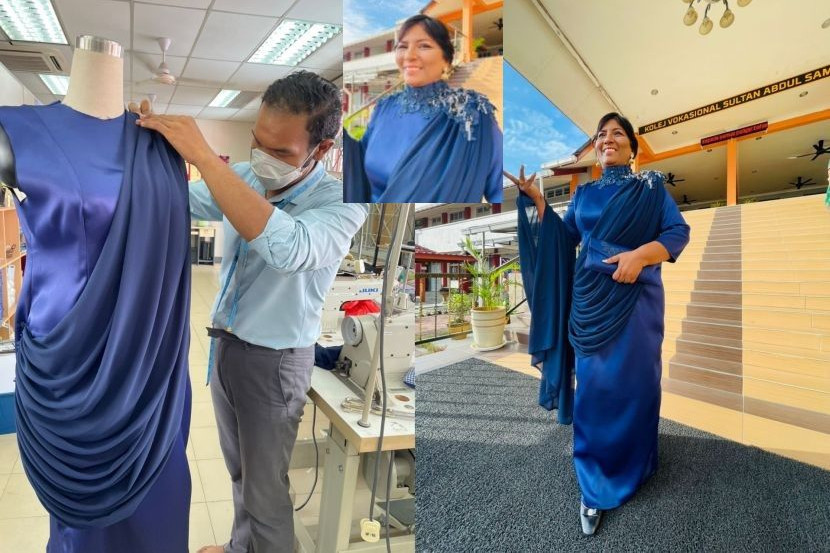 Pemuda berkenaan, Muhammad Hakimi Gunawan berkata, busana tersebut dihadiakan sempena persaraan rakan sekerjanya, Caroline Selvarani Rajasingam Solomon, 60, di Kolej Vokasional Sultan Abdul Samad (KVSAS) di Banting, Selangor pada Jumaat lalu.