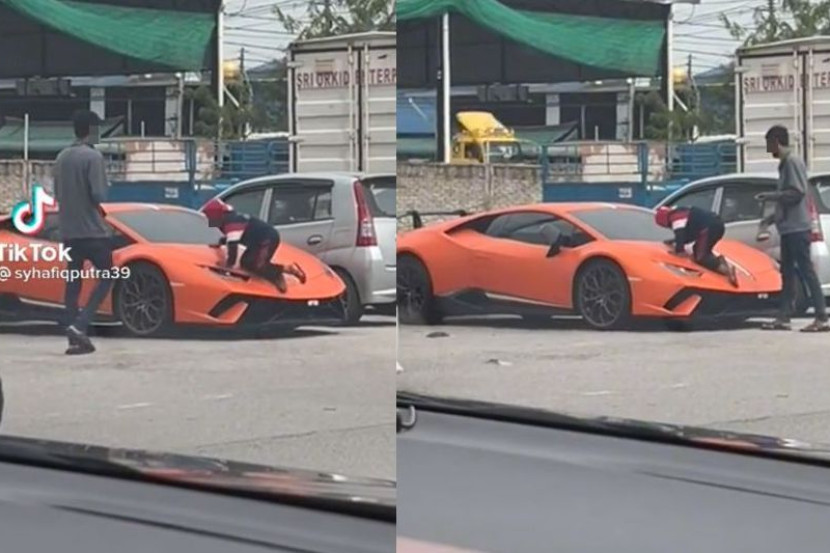 Dalam satu rakaman tular yang dikongsi ke TikTok, dia dilihat sedang memanjat bonet kereta mewah itu sambil diperhatikan seorang lelaki, dipercayai abangnya.