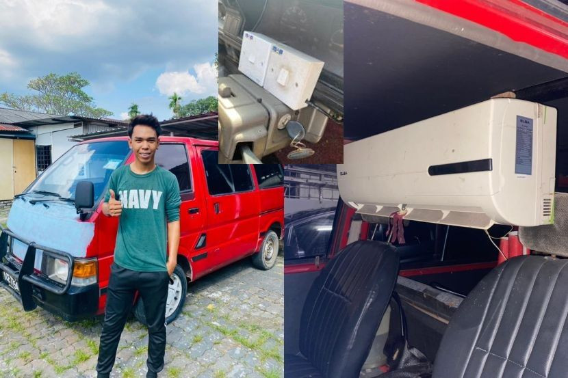:"Aircond tu dari rumah dan sudah rosak. Jadi, timbul idea untuk bawa aircond tu pasang dalam van. Tapi luaran saja nampak macam aircond dan dalam adalah kipas.