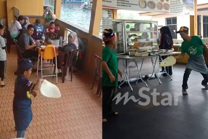 Dalam satu rakaman yang tular di media sosial, kelihatan si cilik ini yang siap mengenakan tanjak begitu asyik menerbangkan roti canai di warung milik bapanya dengan disaksikan para pelanggan yang sedang menikmati sarapan.