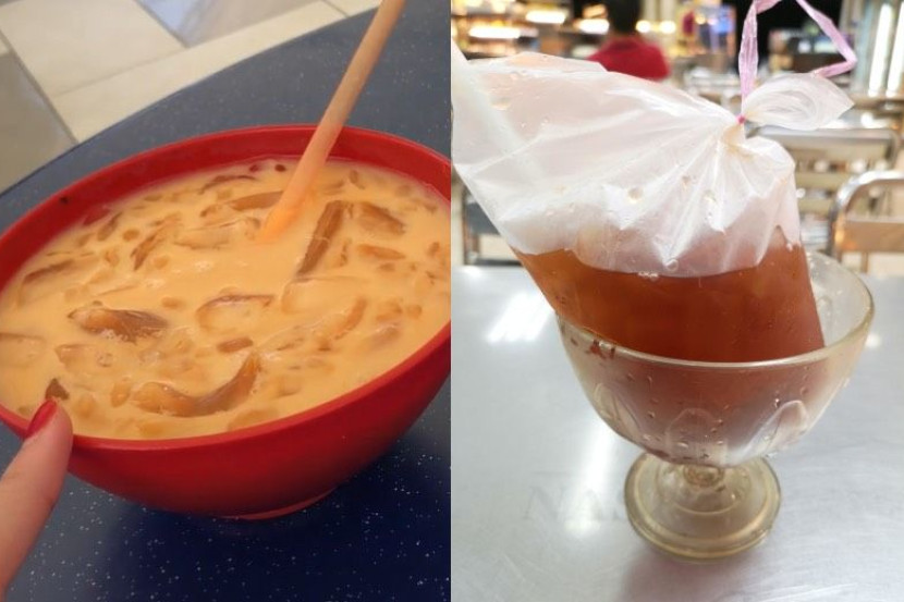 Foto kiri menunjukkan hidangan teh ais diberikan dalam mangkuk oleh peniaga sebuah kedai makan di Johor.