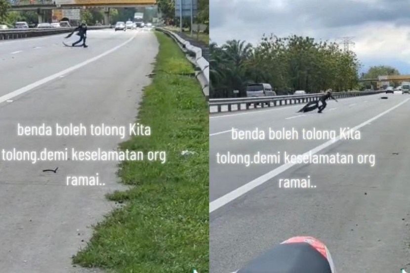 Bukan sekali, tetapi lelaki berkenaan dilihat dua kali ulang alik ke tengah jalan untuk mengutip beberapa serpihan tayar yang agak besar, sebelum mencampakkannya ke bahagian tepi lebuh raya.