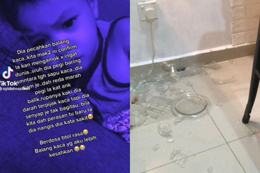 "Tapi saya tak sangka anak dah pun terpijak kaca sebab dia tak menangis. Selesai sapu baru saya perasan kaki dia ada luka.