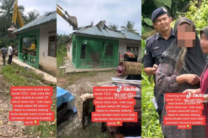 KEHILANGAN tempat berteduh dalam sekelip mata pastinya memberi tamparan hebat kepada sesiapa sahaja. Begitulah yang dialami sebuah keluarga selepas rumah yang dibina dan didiami hampir 40 tahun dirobohkan pihak berwajib. Menerusi rakaman video berdurasi 58 saat yang dikongsikan di TikTok, penghuninya terpaksa memindahkan kesemua barangan serta merta sebelum rumah dirobohkan. Berdasarkan kapsyen, difahamkan rumah tersebut dibina di atas tanah berstatus lesen pendudukan sementara atau TOL. Dakwa individu yang berkongsi video itu, pemilik rumah sudah membuat permohonan kepada pejabat tanah berhubung status tersebut, namun urusan untuk mendapatkan geran gagal. "Setelah hampir beberapa puluh tahun duduk, dah mohon dengan pejabat tanah untuk TOL... akhirnya yang berduit dapat geran dulu," katanya pada ruangan kapsyen. Barangan dipindahkan ke luar rumah sebelum kerja merobohkan bangunan dilakukan. Bagaimanapun tidak dapat dipastikan lokasi insiden berkenaan berlaku. Kisah yang meruntun hati warganet itu tular hingga video yang dikongsikan menerima lebih 2.5 juta tontonan di TikTok. ARTIKEL BERKAITAN: Si bongsu tak sempat kenal abah, ibu minta edit foto arwah suami dukung anak... Ramai tolong cipta kenangan buat lepas rindu ARTIKEL BERKAITAN: Waspada sebelum terkena! Percutian ke Seoul bertukar ‘tragedi’, 4 sekawan jadi ‘homeless’ 3 hari gagal jawab soalan pelik imigresen Bahkan sehingga kini video itu dikongsikan lebih 3,820 pelayar selain turut disiarkan di beberapa platform media sosial lain. Melihatkan kepada kesusahan yang dialami itu, kebanyakan warganet meminta aktivis terkenal, Ebit Lew dan pengendali platform Founder Misi untuk tampil membantu. "@foundermisi @ustazebitlew tolong bantu ya, saya support dana semampu saya. Khemah didirikan berhampiran rumah yang telah diroboh. "@Ebit Lew tolong keluarga ni... semoga ada hikmah di sebalik apa yang terjadi sekarang. "@Founder Misi tuan yang berkenaan memang kita akur itu tanah TOL... harap tuan buat satu misi rakyat untuk keluarga ini, meronta-ronta prihatin kami semua," ujar segelintir netizen di ruangan komen. Pun begitu, tidak kurang juga yang mempersoalkan pemilik video serta keluarga terlibat kerana tidak berusaha mencari tempat tinggal lain walhal sudah mengetahui tanah yang diduduki adalah berstatus TOL. Payah kalau duduk atas tanah bukan hak milik kita, tak kira duduk 100 tahun sekali pun. NETIZEN "TOL ni hanya pendukkan sementara... kalau tak silap TOL ni tak boleh bina rumah kediaman, macam mana sebelum ni boleh bina rumah atas tanah ni? "Payah kalau duduk atas tanah bukan hak milik kita, tak kira duduk 100 tahun sekali pun. Kalau dah dia kata nak, dia tak fikir... kita tak boleh buat apa. "Kita dah tahu yang tanah TOL ni hanya sementara, jika mana-mana kerajaan nak buat sesuatu maka dia ambil, risiko ni kita dah tahu awal-awal... jadi janganlah salahkan," ujar beberapa netizen lagi. Antara komentar dan pandangan netizen. Bagaimanapun, keluarga terbabit mendakwa mereka tidak diberikan notis untuk mengosongkan tapak berkenaan sebelum kerja-kerja merobohkan bangunan dilakukan. Mereka turut mendakwa pihak berwajib datang secara melulu selain turut tidak memberikan sebarang pampasan. Tambahnya, proses merobohkan rumah mereka itu dilakukan oleh pemaju hartanah dan bukannya pihak kerajaan. Dapatkan info dengan mudah dan pantas! Join grup Telegram mStar DI SINI