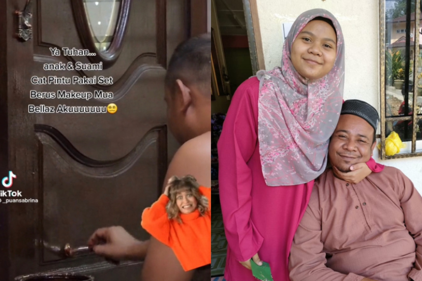 Ramai netizen terhibur melihat gelagat suami dan anak tersebut selamba mengecat pintu rumah menggunakan berus mekapnya.