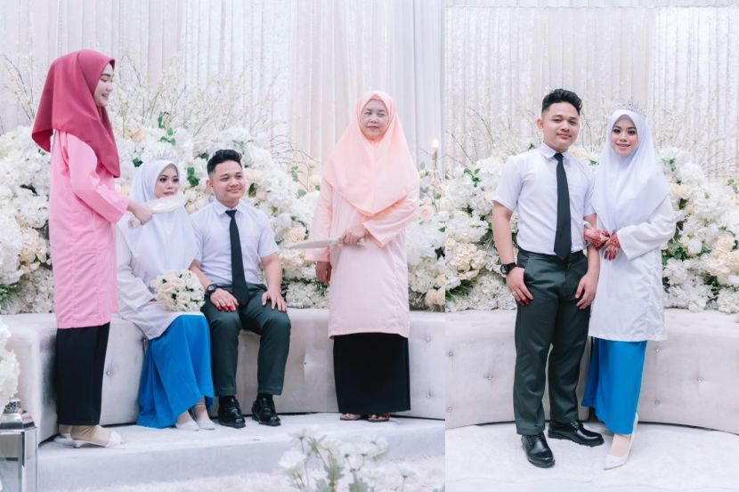Mana tidaknya, kedua-dua mereka diraikan dalam persalinan pakaian seragam sekolah, duduk sopan di pelamin.