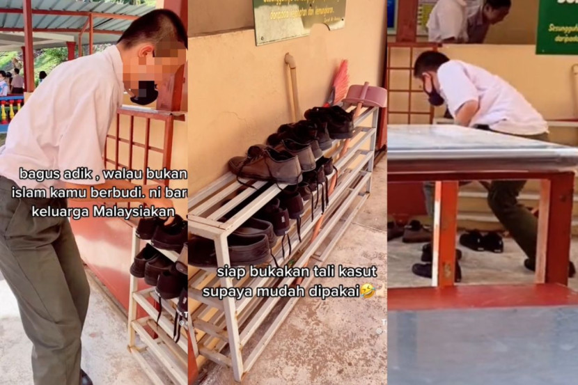 "Jadi dia akan ambil semua kasut dan susunkan. Lebih baik lagi bila dia bukakan tali kasut untuk memudahkan pelajar Melayu Islam pakai nanti," jelasnya pada video kedua.