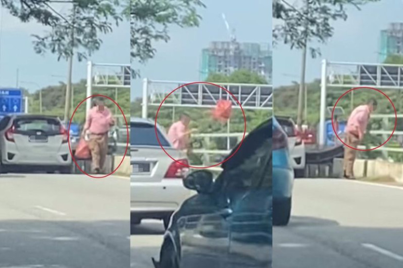 Menerusi video yang dimuat naik oleh seorang pengguna di Facebook B40 Buat Perangai Apa Harini, individu itu turun dari kenderaannya sambil membawa plastik berwarna merah lalu melemparkannya ke bawah.