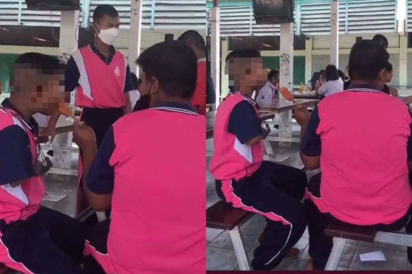 Tangkap layar pelajar OKU disuap makan oleh seorang rakan dalam video yang tular.