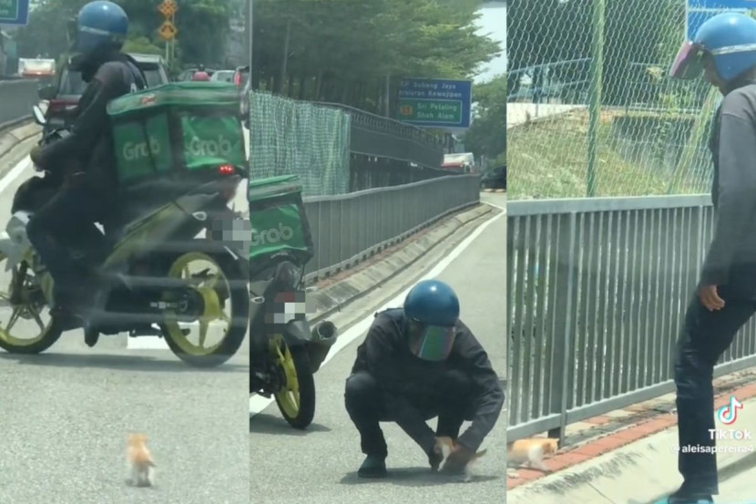 RAMAI tersentuh hati tatkala menonton video tular memaparkan seorang rider GrabFood menyelamatkan seekor anak kucing di tengah jalan.