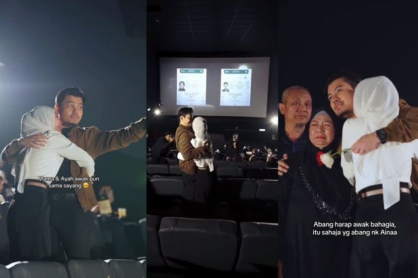 Majlis kejutan yang turut dihadiri ibu bapa Aina menyaksikan mereka mengalirkan air mata kegembiraan selepas visa haji masing-masing ditayangkan di skrin dalam dewan pawagam.
