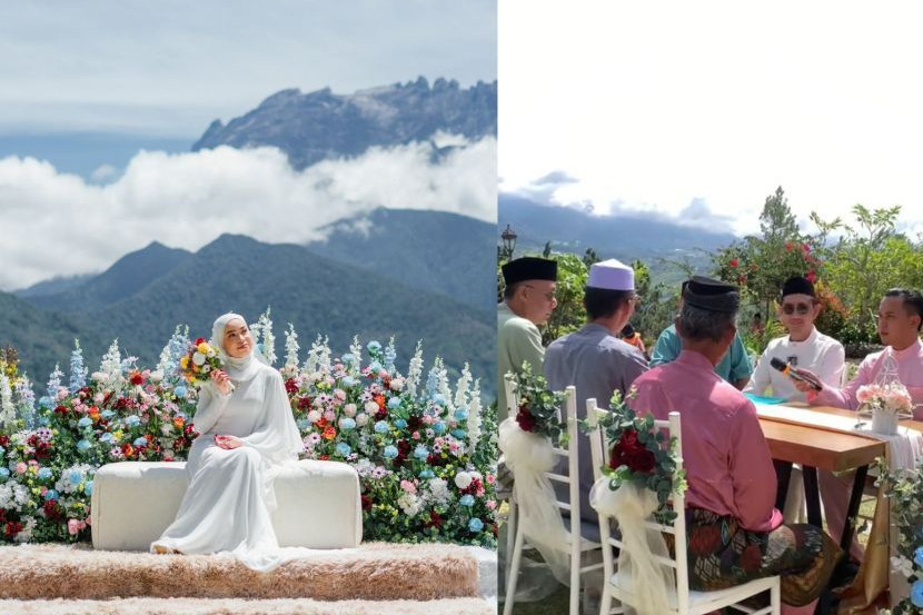 Dengan tema garden wedding, hari bahagia pasangan ini tampak sempurna apatah lagi pelaminnya berlatarbelakangkan Gunung Kinabalu yang tersergam indah.
