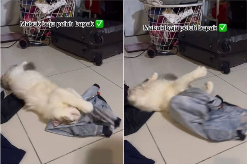 Begitu juga keadaannya bagi kucing ini yang dilihat tergila-gilakan sehelai baju berbau masam dengan peluh.