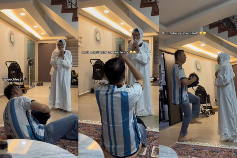 Tidak peduli untuk menjawab soalan isteri, lelaki berkenaan kemudiannya terus duduk melutut sambil meletakkan kedua-dua tangan di dahi seperti menghadap sembah seorang ratu atau kerabat diraja.