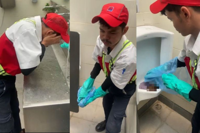 Menerusi video itu, seorang pekerja stesen minyak dikenali sebagai Aris Munandar dilihat sedang membersihkan najis dengan memakai sarung tangan.