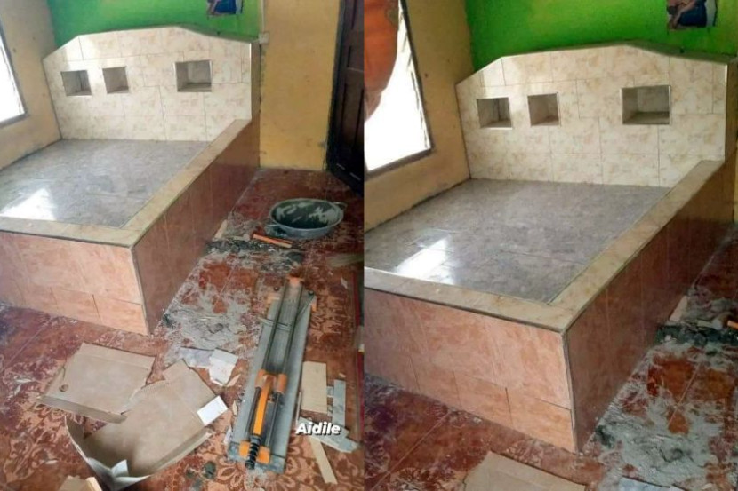 Beberapa gambar turut dimuat naik, menunjukkan proses katil tersebut dibuat sehingga selesai dipasang jubin.
