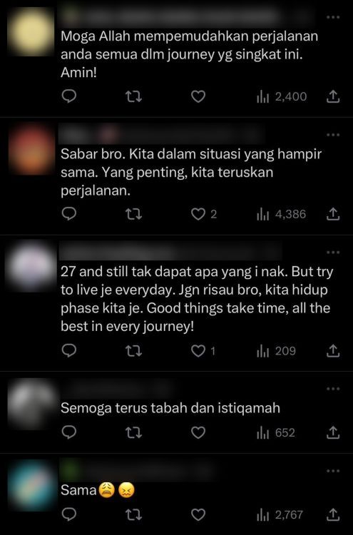 HIDUP setiap insan pasti dihiasi pelbagai cita-cita untuk menuju ke menara gading. Namun, ujian dan cabaran yang mendatang boleh memaksa seseorang itu untuk melupakan impiannya. Begitulah luahan tanpa nama di laman X, mengenai seorang lelaki yang berasa penat menempuh liku-liku kehidupan dan kini hanya mengikut apa yang sudah ditakdirkan buat dirinya. Kegagalan dalam hidup pastinya menyedihkan. -Gambar hiasan Menurut lelaki itu, dia sudah berusaha sehabis baik untuk mengejar apa yang diimpikan tetapi hanya menemui kegagalan. "Aku berusia 30-an dan masih belum berkahwin. Sekarang baru aku faham dengan apa yang dimaksudkan sebagai rezeki dan ujian. "Kita jadi la orang sebaik mana pun, penuhi tanggungjawab sebagai hamba Allah, sebagai seorang anak, abang, dan juga seorang lelaki. Tapi kalau ditakdirkan bukan rezeki kita tak boleh buat apa. ARTIKEL BERKAITAN: Lelaki terkejut jumpa duit, surat ‘wasiat’ arwah sahabat... Terbongkar kisah didera bekas isteri, dianiaya makan bangkai ikan busuk! ARTIKEL BERKAITAN: Pengantin lelaki hati tisu, menangis kakak pakaikan bedak... Si bongsu rindu arwah ibu - “Terbayang macam mak ada dekat belakang” "Tak kisah la kalau kita kerja bagus macam mana pun, belajar setinggi mana pun. Aku tertanya-tanya, teruk sangat ke aku ni? Akhirnya aku menyerah kalah, biarlah aku jadi orang biasa-biasa je, tak bercita-cita tinggi dah. "Hidup sekadar hidup dan bersyukur dengan apa yang ada. Sementara itu, terus menjalankan tanggungjawab yang dipikul," ujarnya yang mengakui tidak bersemangat. Walaupun hidup ni kosong, kawan dengan orang baik-baik dan soleh. Ada masa lapang hadiri majlis ilmu, kumpul bekalan akhirat. WARGA MAYA Tiada siapa menyangka dia sebelum ini pernah berhasrat untuk mempunyai kehidupan yang selesa, tetapi impian itu kini hanya berkubur begitu sahaja. "Dulu ada usaha nak dapatkan kerja elok, ada rumah, cari pasangan dan kahwin supaya boleh jalan-jalan sekeluarga dengan anak. Itu dulu niat aku, konon nak mengubah hidup. "Sekarang aku hanya mampu tersenyum seorang diri apabila terkenangkan semua angan-angan itu. Jauh betul aku merancang. Adik-beradik dan kawan-kawan sekarang sibuk ada keluarga sendiri. "Aku pula kalau tengok cermin rambut dah banyak beruban, badan pun lenguh. Aku tahu bukan aku seorang je yang hadap macam ni. Ini sekadar luahan, apa yang Tuhan bagi aku terima," katanya. Sebahagian ciapan balas warga maya. Menjengah ke ruangan ciapan balas, rata-rata warga maya mengakui turut berkongsi perasaan yang dialami pemuda berkenaan. "Sama bro, terkilan tu ada tapi tak apa, bersyukur kita bangun pagi masih bernyawa, dapat bergerak ke sana dan ke sini. InsyaAllah Tuhan akan tambah lagi nikmat. "Walaupun hidup ni kosong, cuba kawan dengan orang baik-baik dan soleh. Ada masa lapang hadiri majlis ilmu, kita kumpul bekalan akhirat. "Hidup ni 'keras' tapi kita teruskan juga kehidupan, semoga yang senasib sentiasa kuat mengharungi hari-hari seterusnya," kata sebahagian warga maya. Jadilah sebahagian daripada geng mStar! Follow kami di Telegram, Twitter, TikTok, Facebook, Instagram dan YouTube
