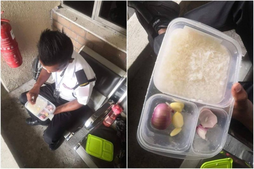 "Insan terpilih abang ni, kerja rajin. Gaji sama banyak dengan pengawal keselamatan lain, tapi nampak dia makan nasi putih dengan kuah air masak je. Lauk dia cuma ada bawang besar, saya ulang bawang besar ya.