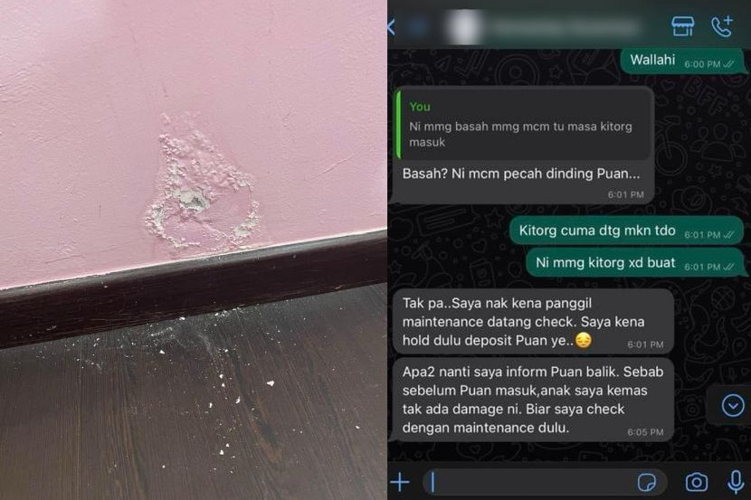 Individu tersebut turut memuat naik gambar dinding yang rosak serta perbualannya bersama pemilik homestay di aplikasi WhatsApp.