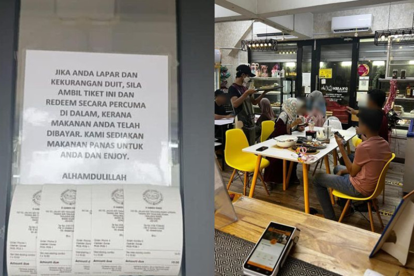 "Jika anda lapar dan kekurangan duit, sila ambil tiket ini dan redeem secara percuma di dalam kerana makanan anda telah dibayar. Kami sediakan makanan panas untuk anda dan enjoy. Alhamdulillah," demikian menurut nota berkenaan.
