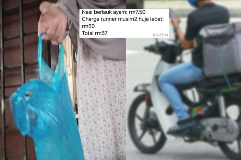 "Nasi berlauk ayam RM7.50, caj runner musim hujan lebat RM50. Total RM57," demikian jawapan runner berkenaan sebagaimana yang terpapar dalam tangkap layar perbualan di aplikasi WhatsApp.