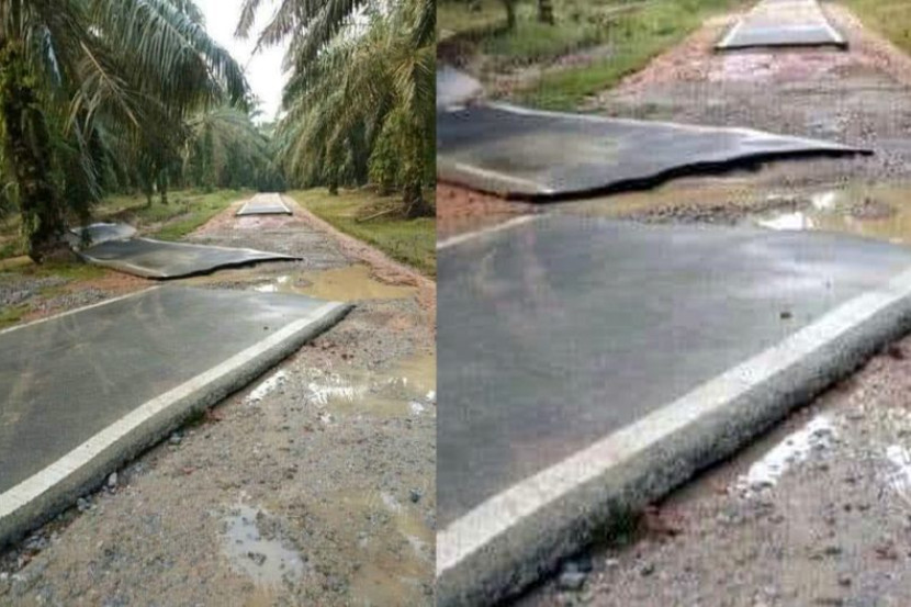 Menerusi gambar tular, situasi yang berlaku itu seolah-olah disunting kerana jalan tar berkenaan bukan sahaja terpotong malah berubah dari kedudukan asalnya dan berlipat-lipat.