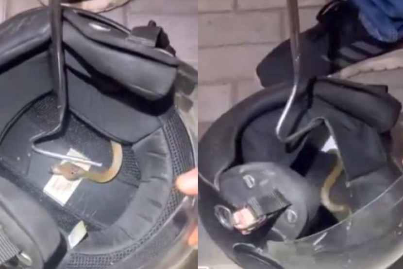 Salah seorang individu dipercayai pemilik topi keledar berkenaan cuba melihat bahagian dalam topi keledar sebelum seekor anak ular keluar sambil mengembangkan kepala dan bersedia untuk mematuk.