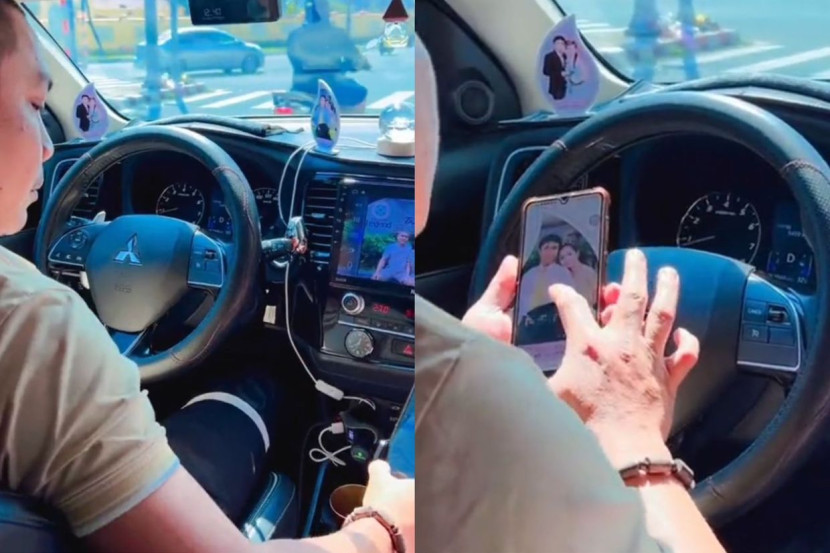Berdasarkan rakaman, lelaki berkenaan dengan bangganya membingkaikan foto dia dan isteri dan diletakkan di atas papan pemuka kereta.