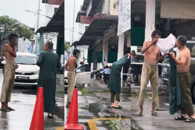 Menerusi rakaman yang dikongsikan Afhi Affandy, lelaki dikenali sebagai Haji Wan itu dilihat menyerahkan pakaian berkenaan kepada seorang gelandangan di tepi jalan.