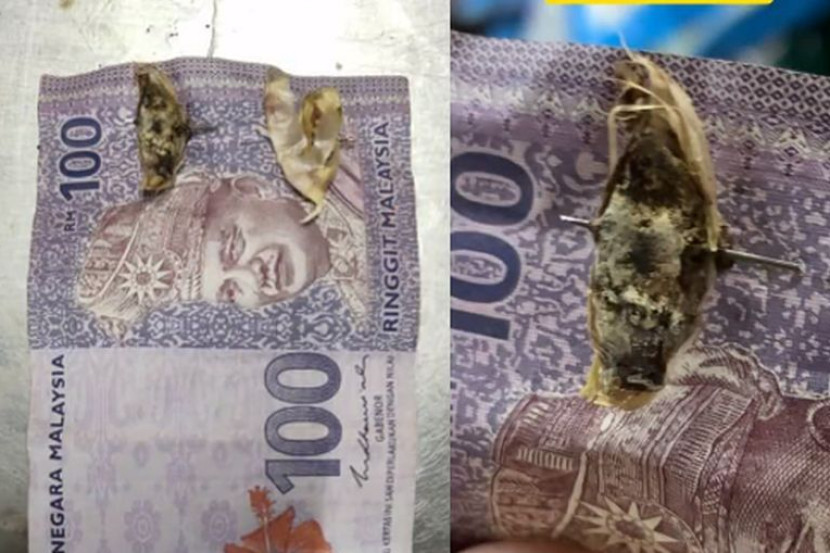 Berdasarkan rakaman video yang disertakan, kelihatan duit kertas bernilai RM100 dicucuk dengan bawang putih yang telah diisi dengan bahan kotor sehingga mengering dan busuk.