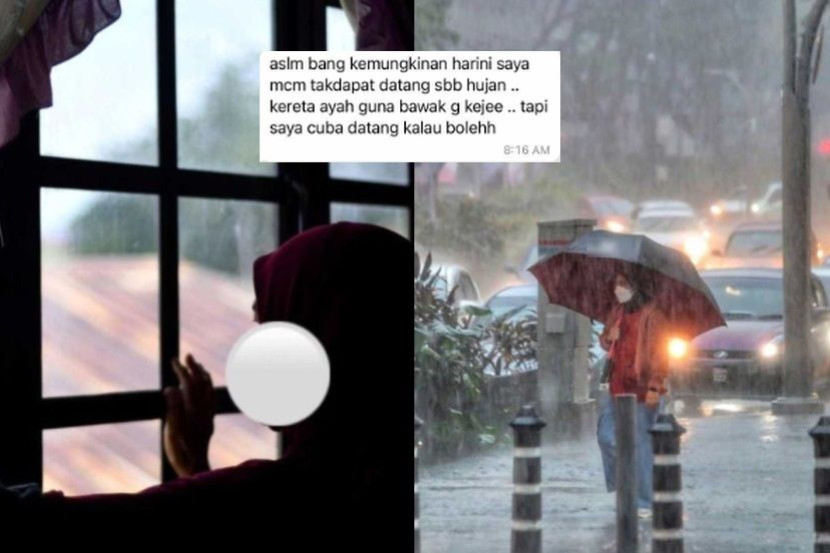 Pada mulanya, staf berkenaan menghantar mesej menerusi aplikasi WhatsApp pada pukul 8.16 pagi memaklumkan masalah yang dihadapi iaitu tidak mempunyai kereta untuk ke tempat kerja kerana hujan.