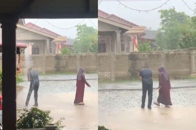 Begitu juga dengan pasangan suami isteri ini yang mandi hujan bersama-sama di hadapan rumah dengan harapan impian memiliki cahaya mata tercapai.