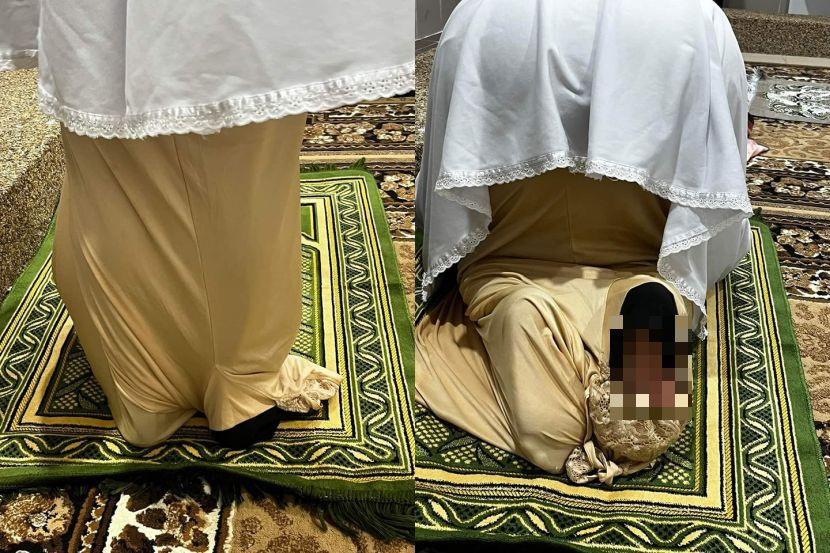 Seorang jemaah wanita menggunakan telekung untuk dibuat kain pakai sehingga mendedahkan auratnya ketika solat. -Foto Facebook
