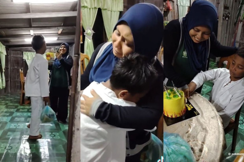 Dalam rakaman itu, Mas'ud yang dilihat tidak dapat menahan sebak terus memeluk ibunya yang sedang berdiri memegang kek di ruang tamu rumah sewa mereka di Kuala Terengganu.