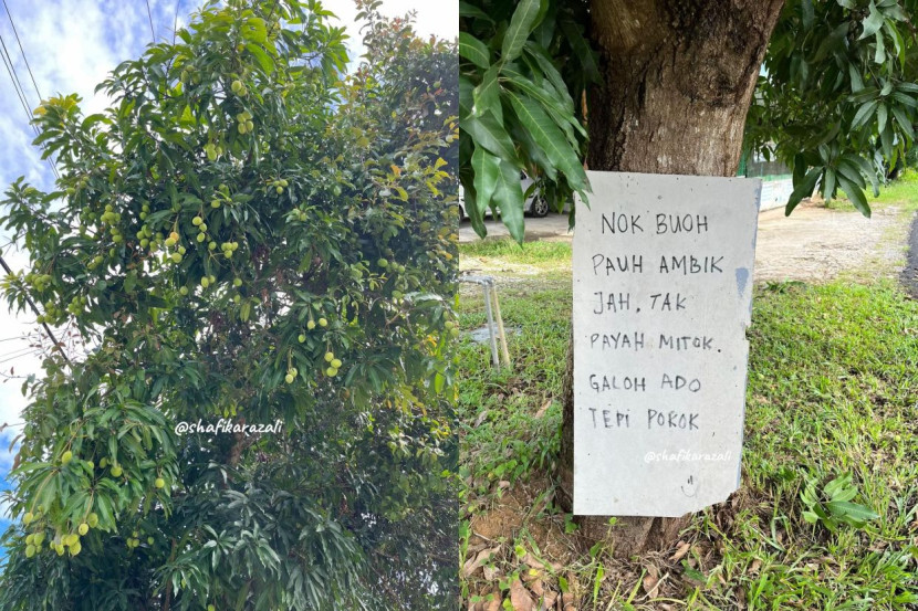 "Nok buoh pauh ambik jah, tak payah mitok. Galoh ado tepi pokok (nak buah mangga ambil saja, tak perlu minta. Galah ada tepi pokok)," demikian ayat yang ditulis pada nota itu.