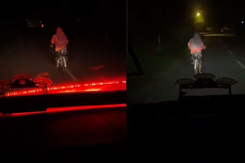 Menerusi video yang dikongsi di media sosial, wanita itu dilihat sedang mengayuh basikal dalam kegelapan malam sambil diekori sebuah ambulans ke rumahnya.