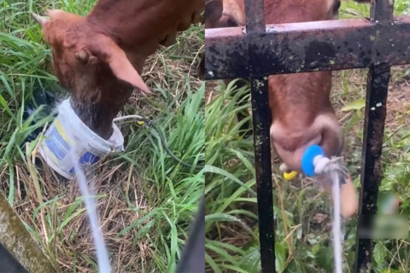 "Terus 'bergaduh' saya dengan lembu tu, susah saya nak isi air apabila baldi tu terbalik. Nasib baik lembu tu macam bijak tegakkan semula baldi, saya pun jirus air sampai penuh," ujar wanita itu lagi.