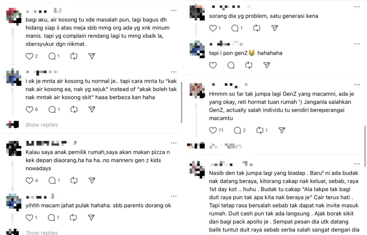 MUSIM raya memang seronok dapat berkumpul dan beraya di rumah saudara-mara serta sahabat handai. Tapi nampaknya, tak semua yang datang beraya sebagai tetamu faham tentang adab bertandang ke rumah orang. Seorang pengguna media sosial baru-baru ini meluahkan rasa kecewa dengan sikap segelintir tetamu gen Z yang dikatakan kurang beradab ketika beraya.Dalam perkongsiannya, individu tersebut berkongsi pengalaman mengecewakan selepas menerima kunjungan anak-anak muda yang datang beraya bersama ibu bapa mereka.Seorang wanita menceritakan pengalaman ketika menerima kunjungan tetamu Gen Z. -Gambar hiasan"Patut la orang tak suka gen Z! Tahu datang beraya rumah orang ikut ibu bapa anda. Tapi datang rumah orang, ingat kau princess ke? “Dah la datang muka macam apa je, salam pun tak nak. Lepas makan boleh duduk macam tu je."Bukan suruh mengemas tapi sekurang-kurangnya ada common sense la,” ujarnya dalam hantaran tersebut.Lebih mengejutkan, ada yang tanpa segan silu meminta minuman sejuk dengan cara kurang sopan.ARTIKEL BERKAITAN: Perangai pendidik gen Z mengadu hal murid di media sosial buat ramai hilang hormat - “Matanglah sikit cikgu!”ARTIKEL BERKAITAN: Dilabel manja, Gen Z sindir Gen Y! Minta henti salahkan orang lain - “Kenapa common sense tu tak ajar dekat anak sendiri?”Tak cukup dengan itu, wanita itu turut menceritakan bahawa individu berkenaan tanpa segan silu meminta lauk tambahan."Kemudian ada (tetamu) yang siap cakap kak nak air kosong, tapi nak yang sejuk eh. Kau ingat rumah aku kedai?"Lepas tu siap cakap (minta) rendang lagi. Baik-baik saya nak jamu piza dan kek yang ada dekat dapur, terus simpan balik."Saya okay je minta air kosong tu... normal je. Tapi cara minta tu. Sepatutnya akak boleh tak nak minta air kosong sikit. Berbeza kan," jelasnya. Jangan salahkan gen Z, sebenarnya salah individu tu sendiri.NETIZENLuahan tidak puas hati dibuat wanita ini pantas mencetuskan perdebatan dalam kalangan netizen selepas dikongsikan. Ada yang bersetuju bahawa adab semakin berkurang dalam kalangan Gen Z, tapi tak kurang juga yang mempertahankan mereka.Meninjau komen netizen, ada yang berpendapat masalah ini tidak wajar dikaitkan dengan generasi, tetapi lebih kepada cara didikan ibu bapa.“Ni bukan salah Gen Z. Ni salah mak bapa yang tak ajar anak adab.Komen netizen di media sosial."Setakat ni tak jumpa lagi Gen Z yang macam ni. Ada je yang okay, reti hormat tuan rumah. Jangan salahkan Gen Z, sebenarnya salah individu tu sendiri.“Betullah tu. Gen Z yang jenis manja je macam ni. Kalau dapat ibu bapa yang strict, jauh beza. Tak payah suruh, dia sendiri yang tolong kemas," komen netizen.Untuk makluman, Gen Z atau Generasi Z, merujuk kepada generasi yang lahir antara pertengahan 1990an hingga awal 2010an.Mereka adalah generasi yang tumbuh dalam era digital dan internet, menjadikan mereka sangat akrab dengan teknologi, media sosial dan komunikasi online.