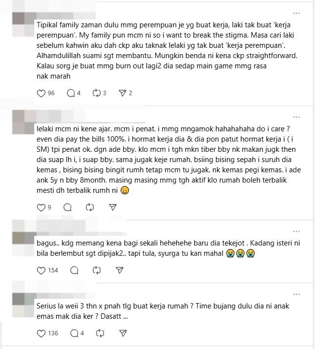 "Serius la wey tiga tahun tak pernah tolong buat kerja rumah? Masa zaman dia bujang dulu dia ni anak emas mak dia ke? Dahsyat," komen beberapa netizen.