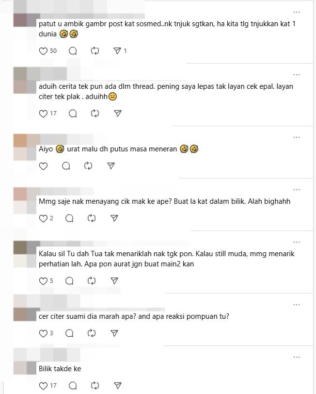 "Nasib baik tak lama lepas tu, suami dia masuk rumah nampak isteri sendiri menayang buah dada. Terus kena marah dan disuruh masuk bilik," katanya menutup cerita.