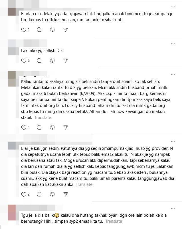"Tak pentingkan diri. Itu hak awak. Suami boleh berusaha lagi cari pendapatan lain. Gadai-gadai ni pilihan terakhir bukan awal-awal terus fikir gadai," komen beberapa netizen.