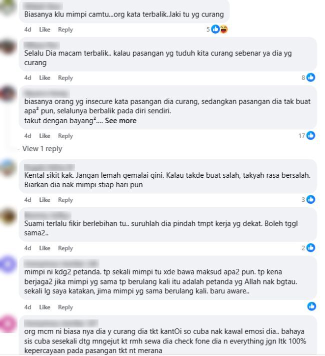 "Jangan-jangan suami adik yang curang sebab dia yang mimpi… nak tutup aib, dia cakap kita yang curang. Akak dah alami.